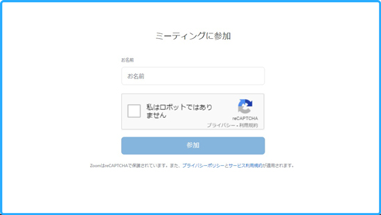 - 「お名前」を入力する画面になりますので、Zoomで表示させる名前を入力してください。最後に「私はロボットではありません」にチェックして「参加」ボタンをクリックします。