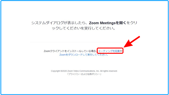 - Zoomオンライン問い合わせサービスのバナーをクリックしていただくと、下のようなブラウザ画面が立ち上がりますので「ミーティングを起動」をクリックします。
